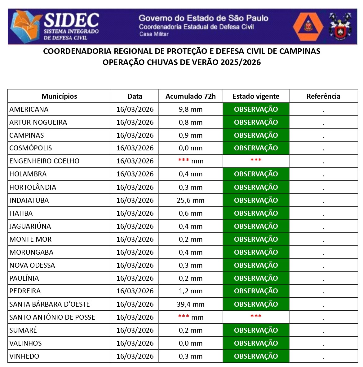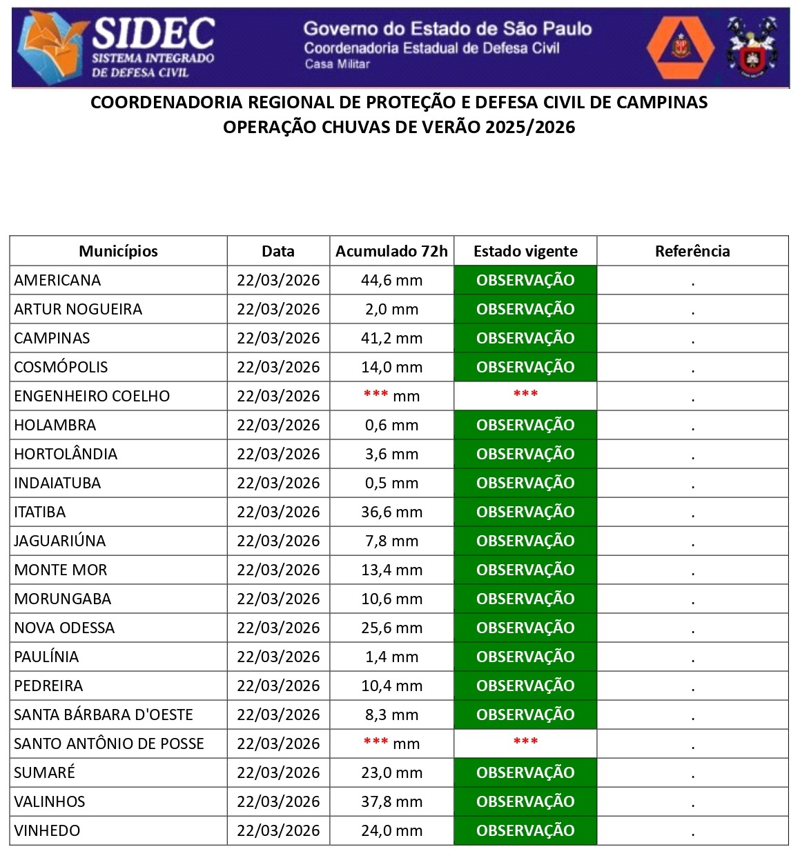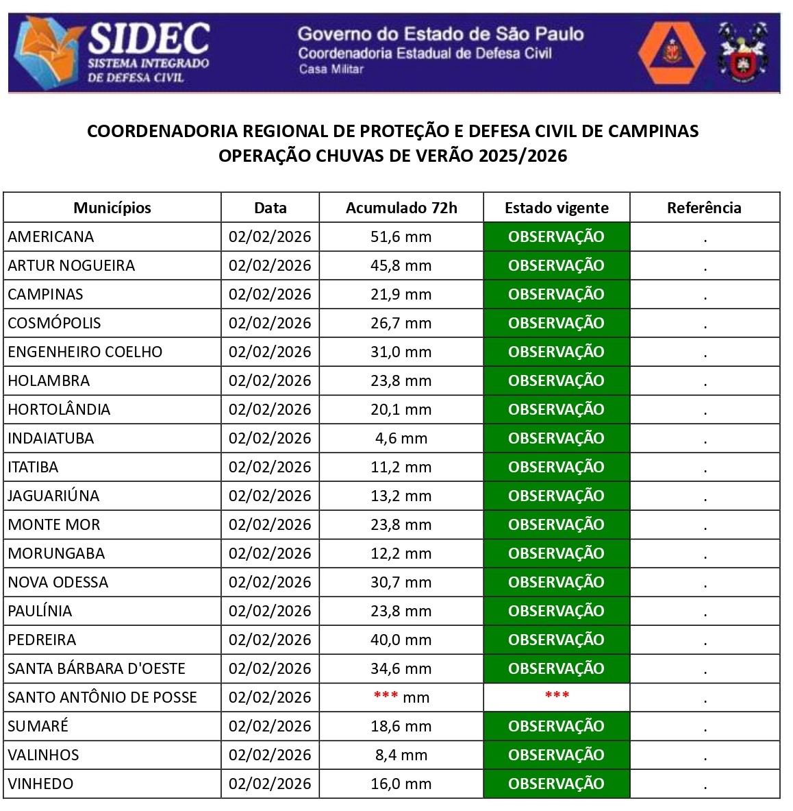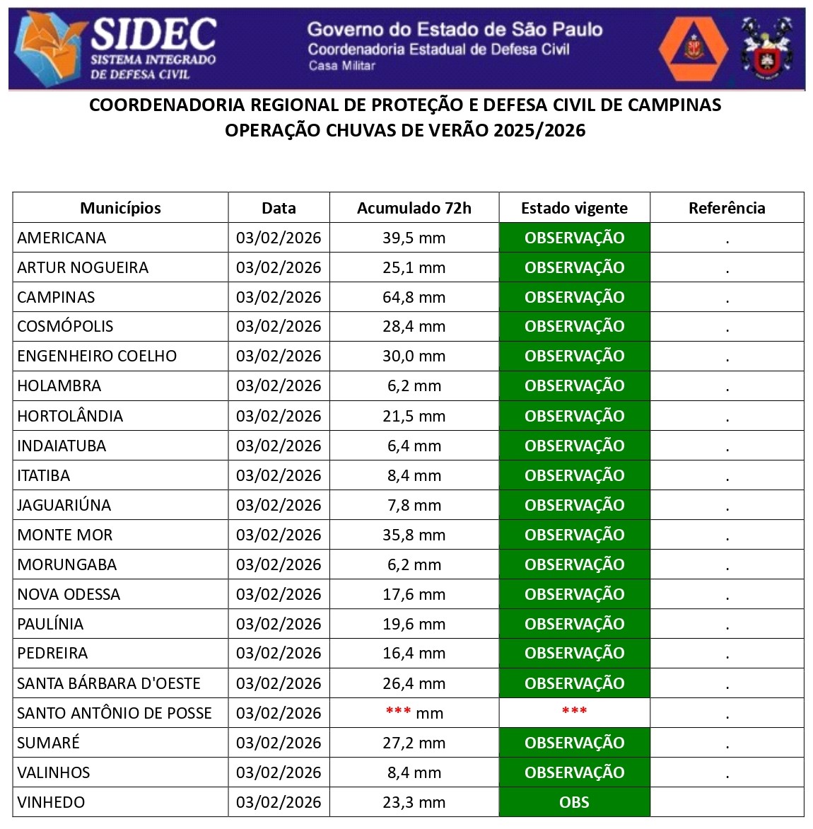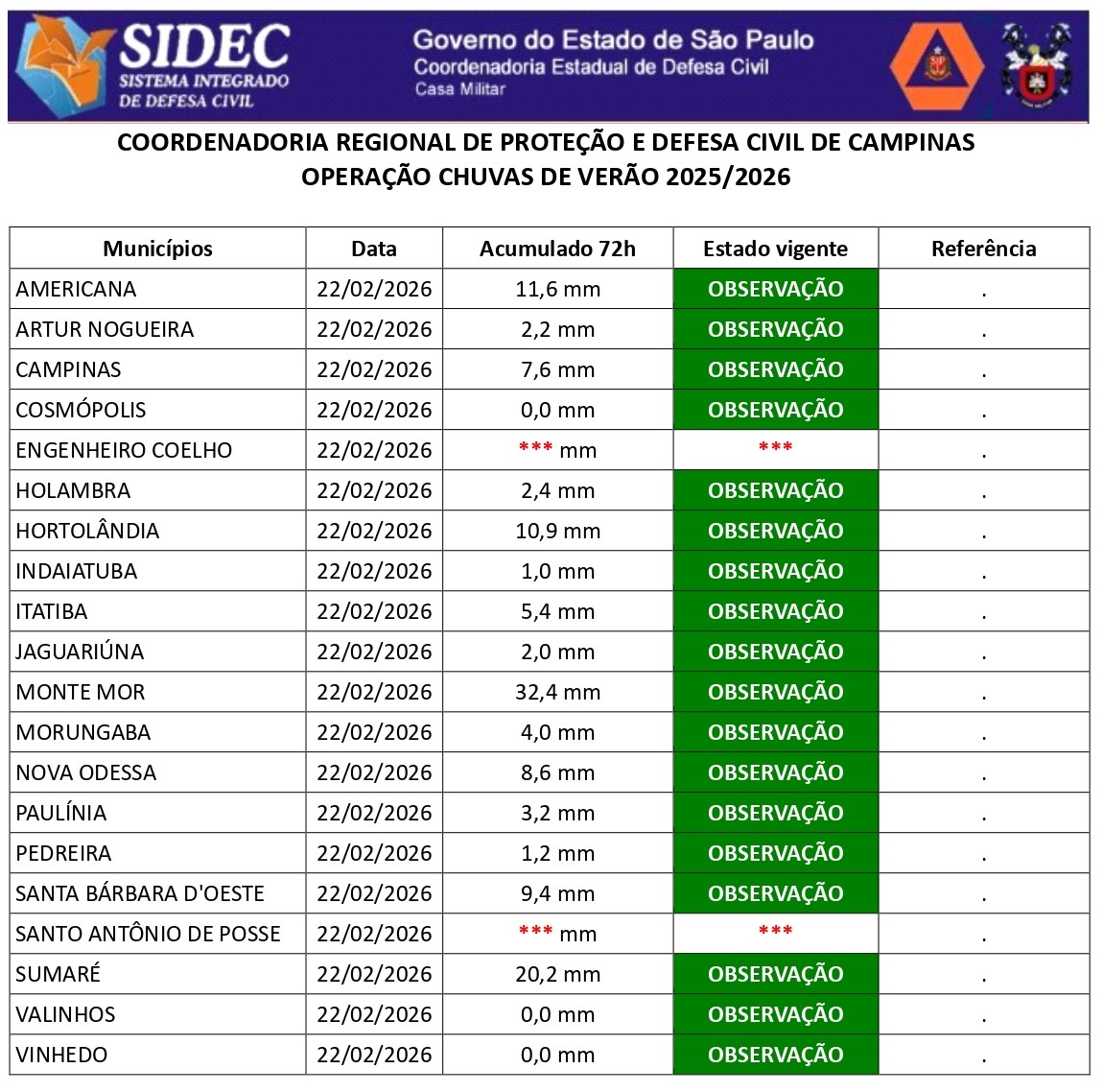 Histórico - ÍNDICE PLUVIOMÉTRICO – OPERAÇÃO CHUVAS DE VERÃO