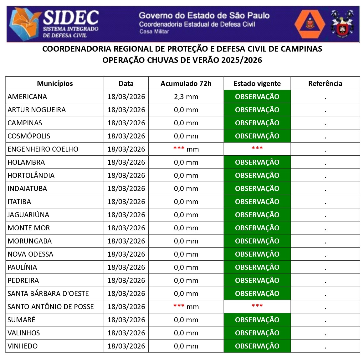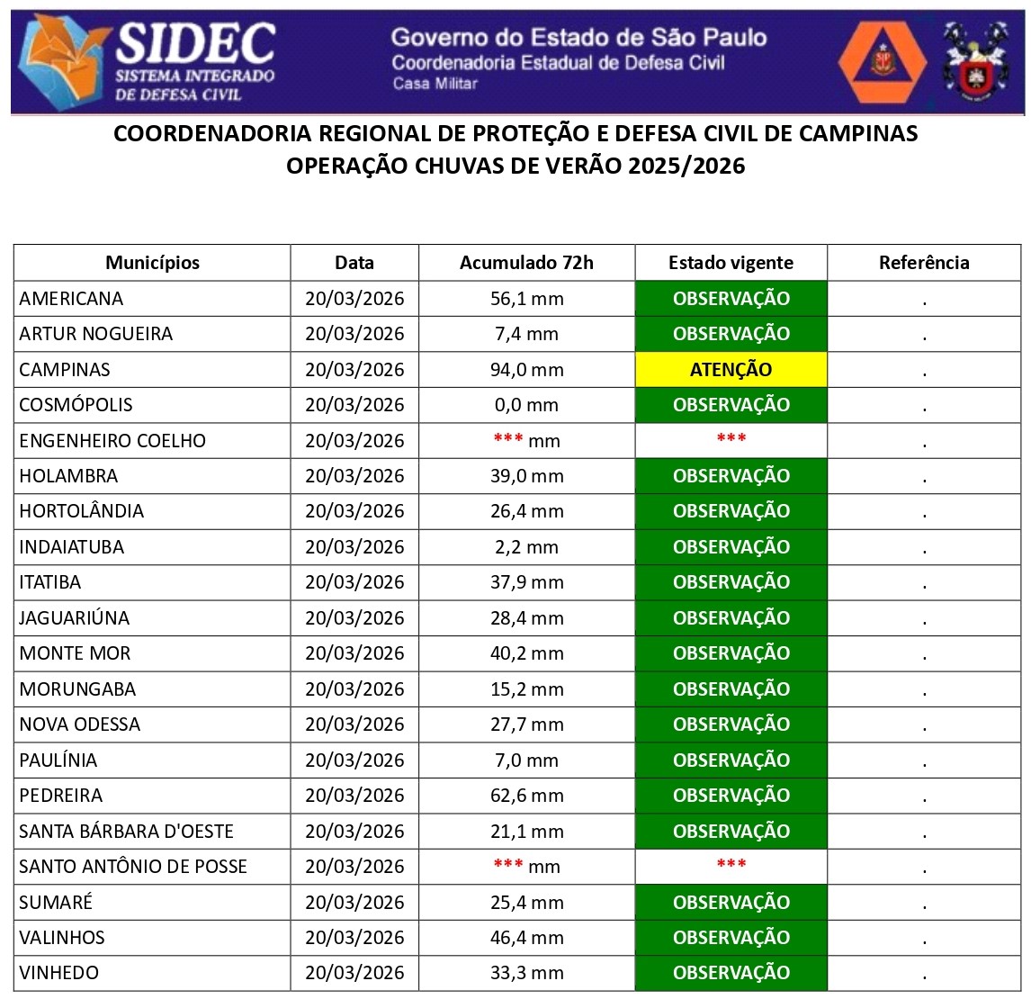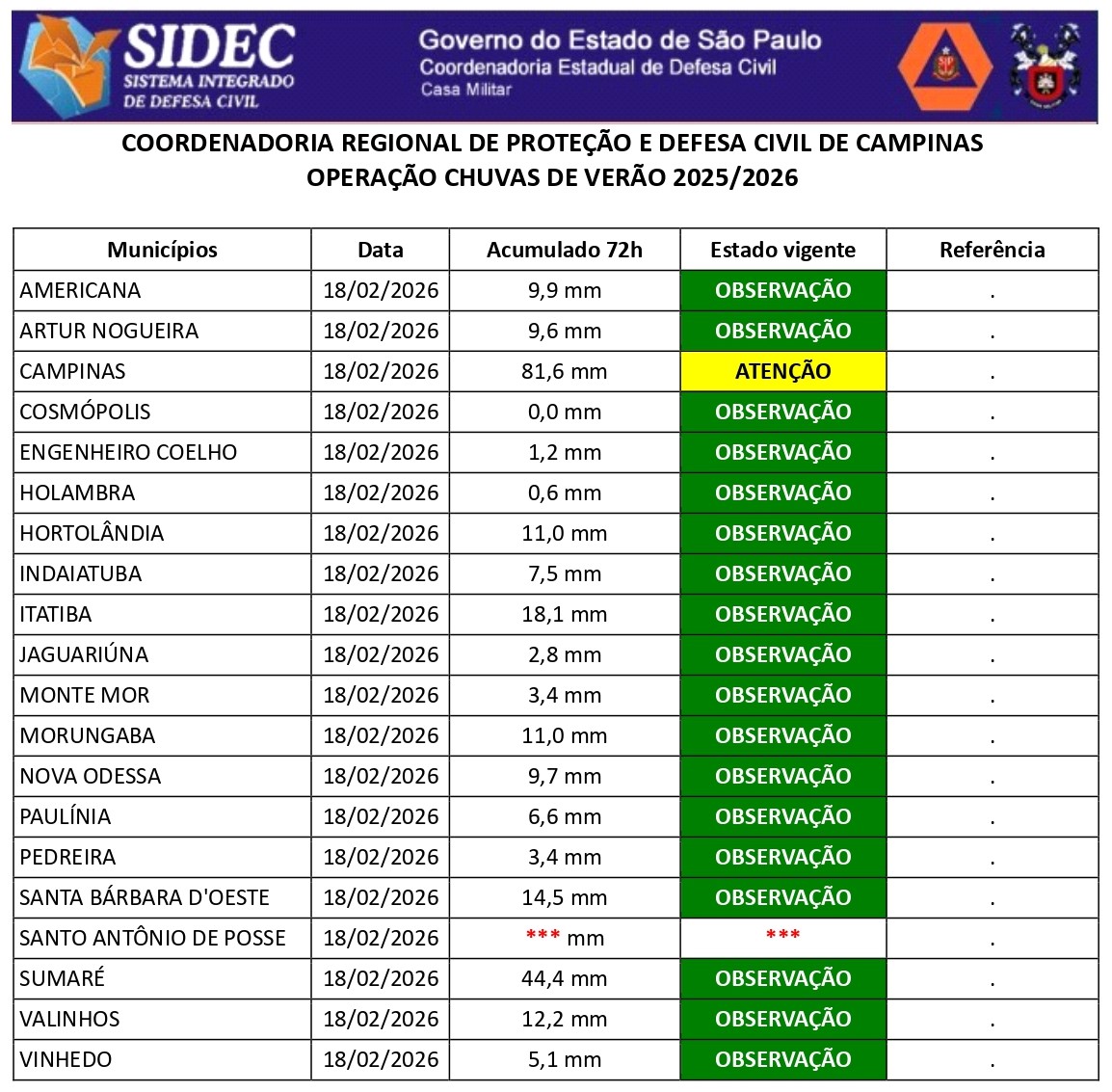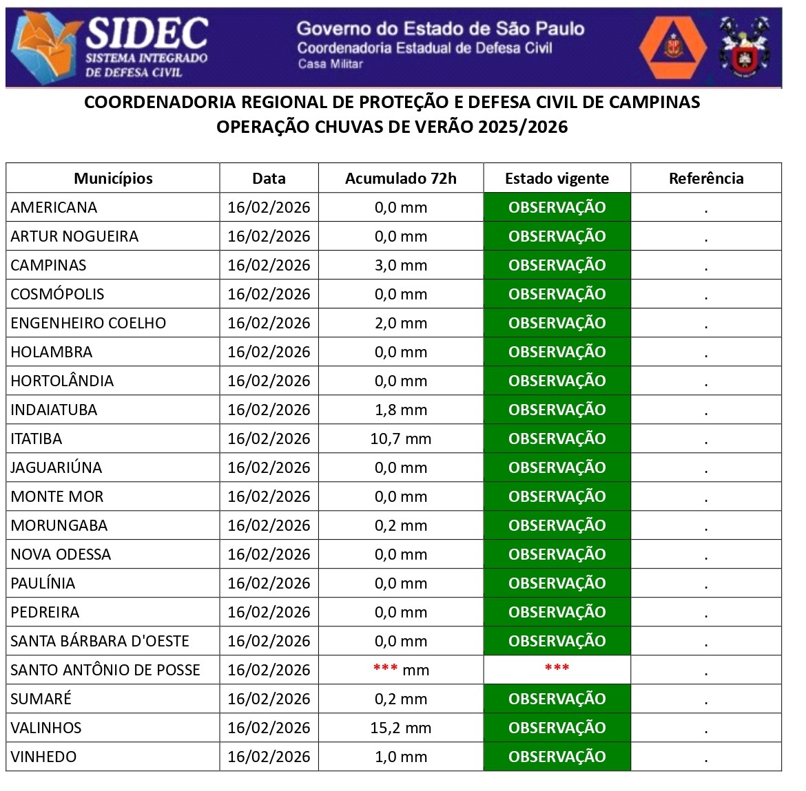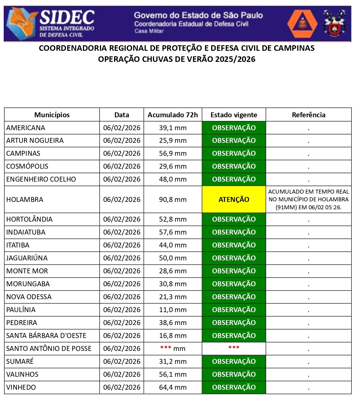 Histórico - ÍNDICE PLUVIOMÉTRICO – OPERAÇÃO CHUVAS DE VERÃO