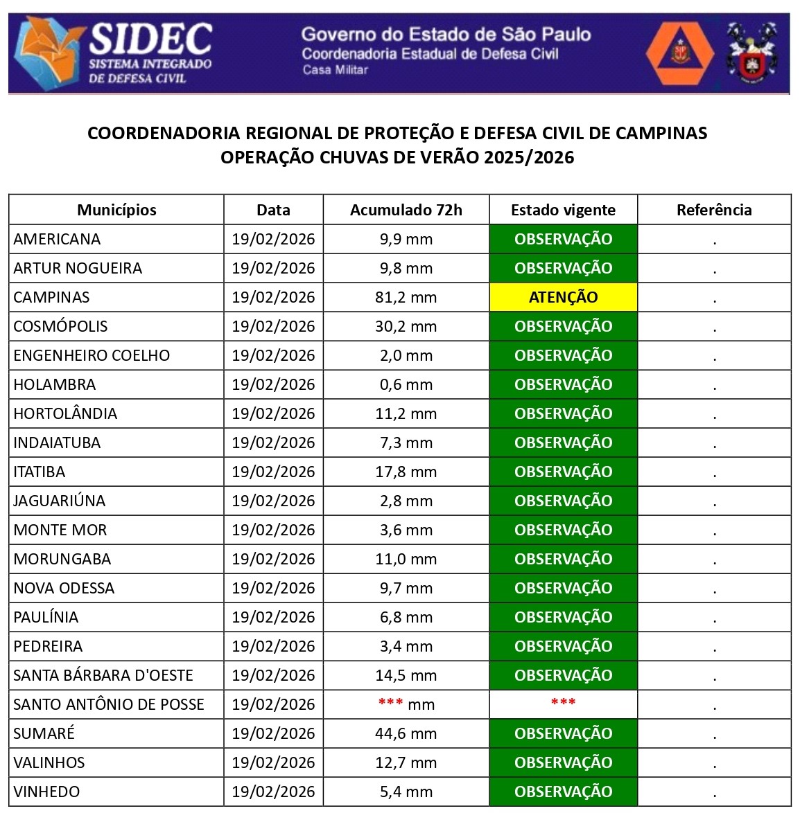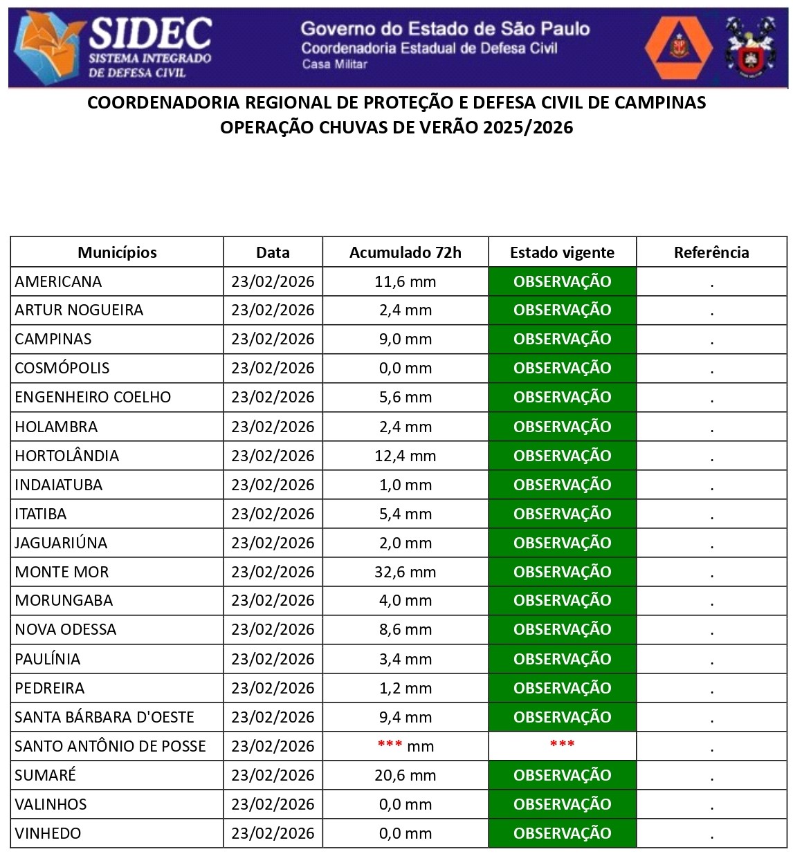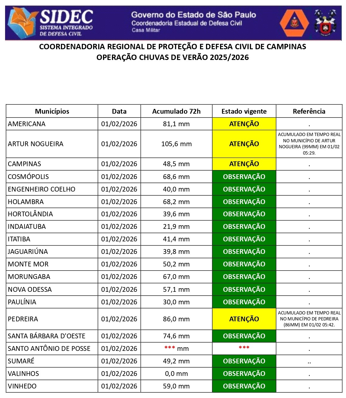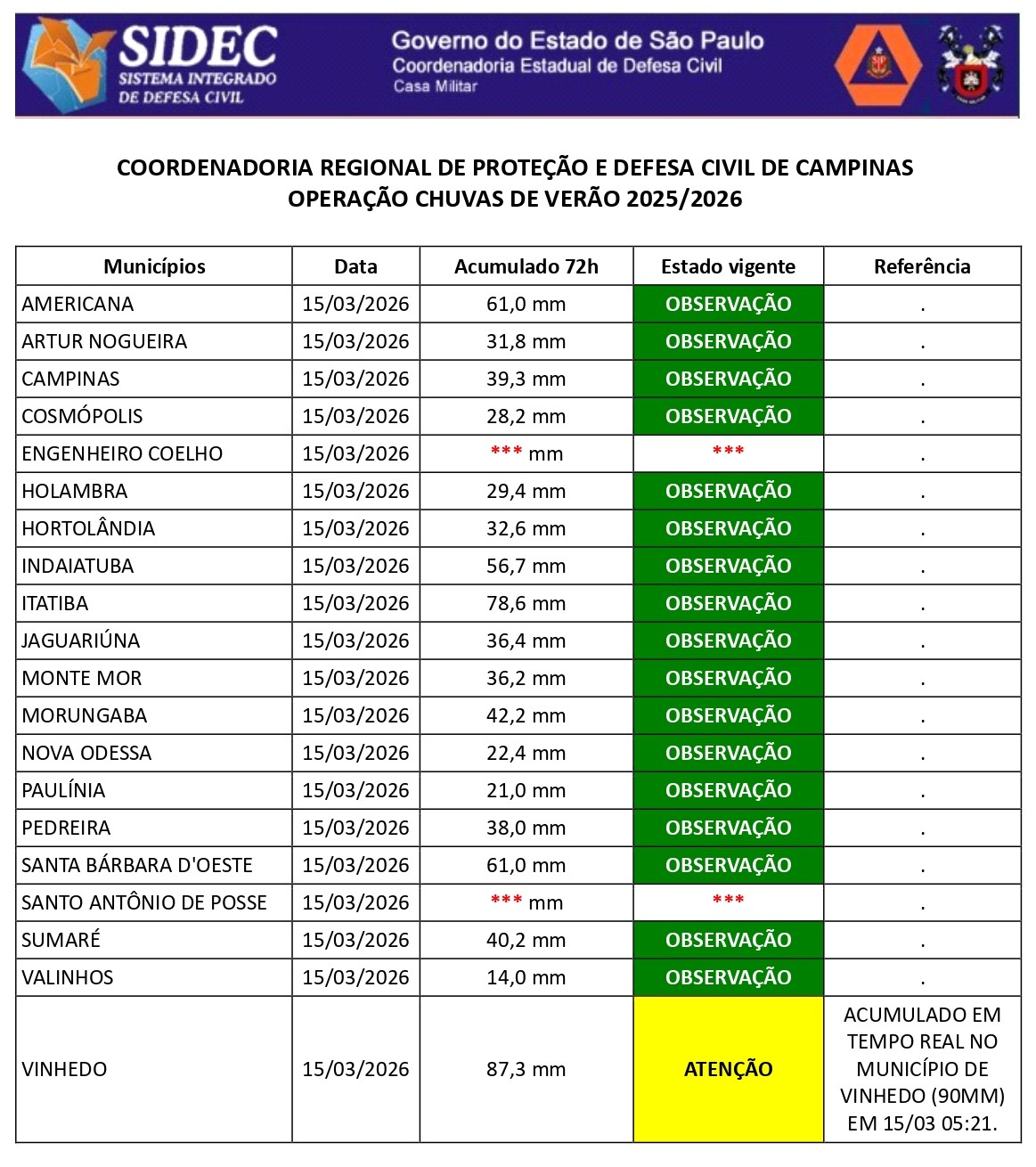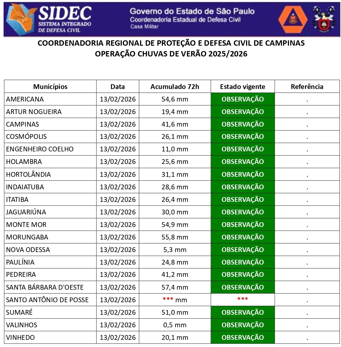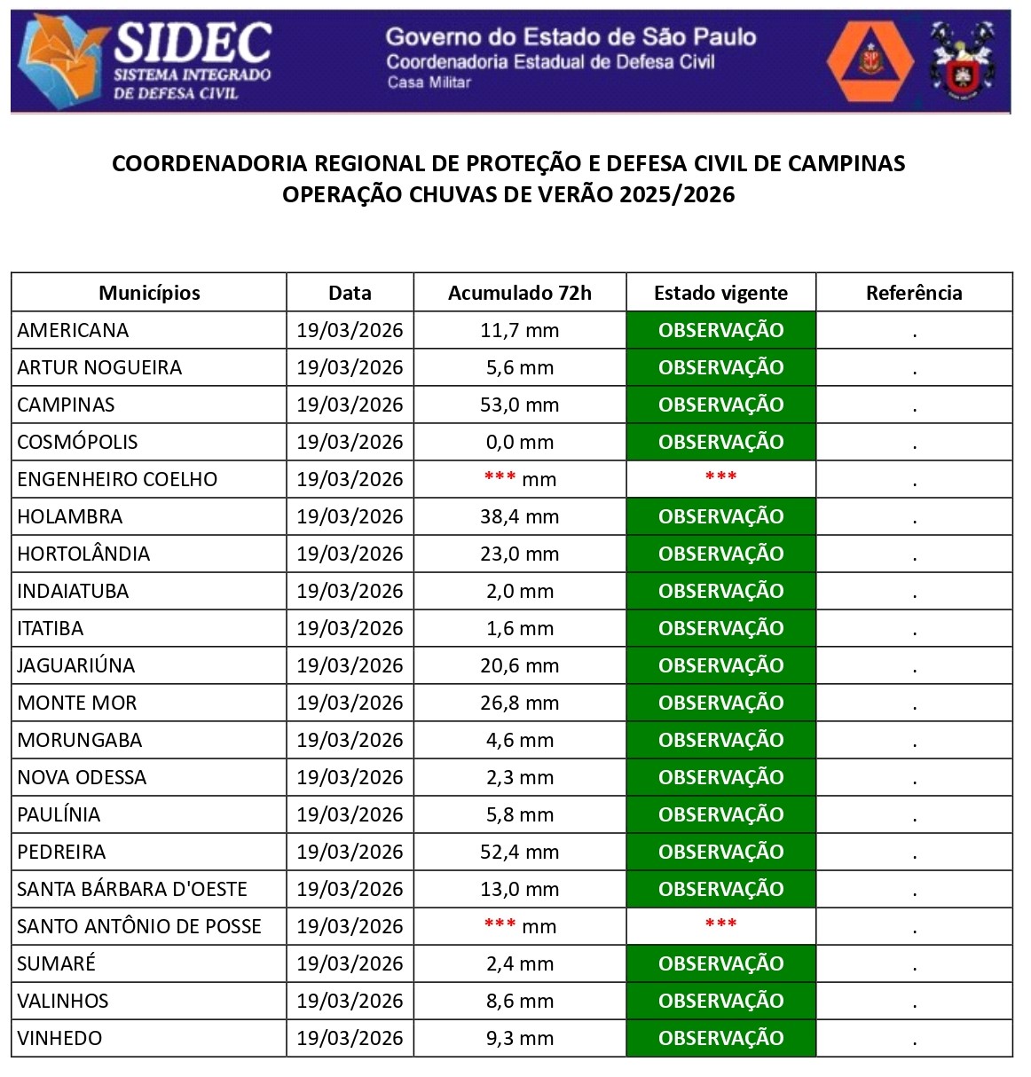 Histórico - ÍNDICE PLUVIOMÉTRICO – OPERAÇÃO CHUVAS DE VERÃO